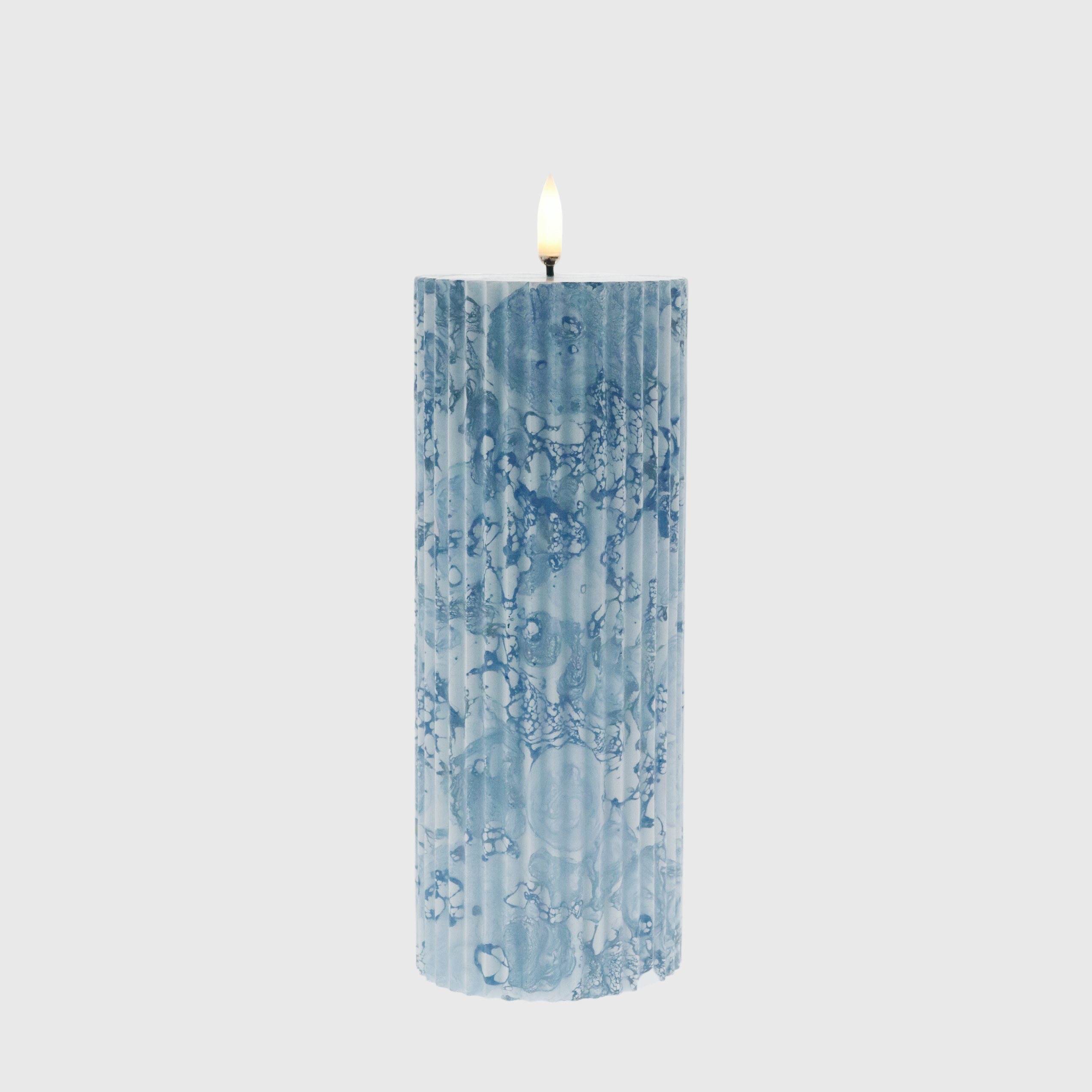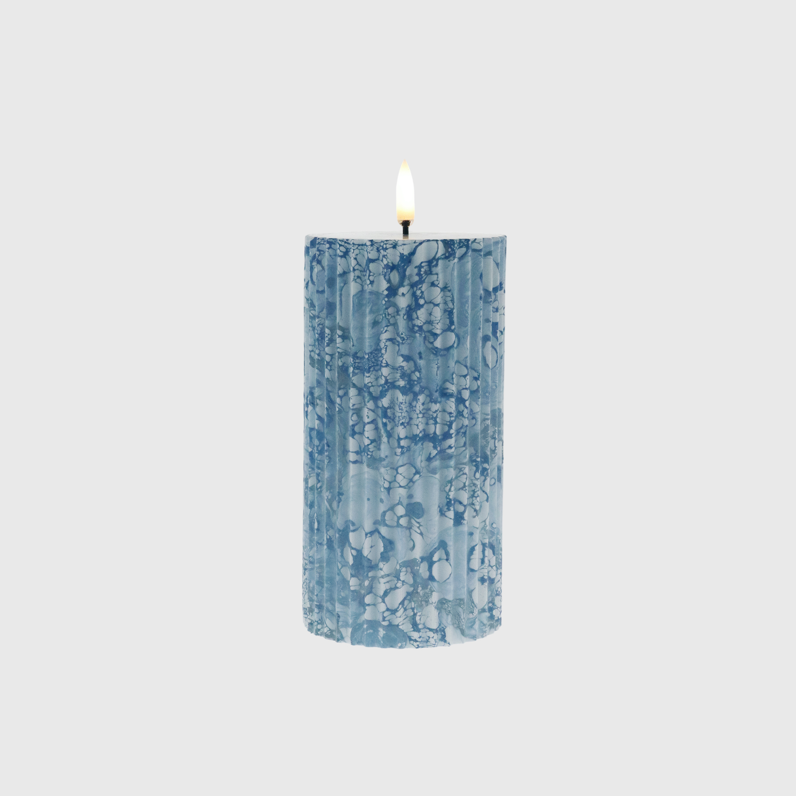 Blue marbling with subtle grooved texture gives this candle both depth and character. Its lifelike flame glows gently, adding tranquility and artistry to any room while enhancing modern and traditional décor with equal grace.