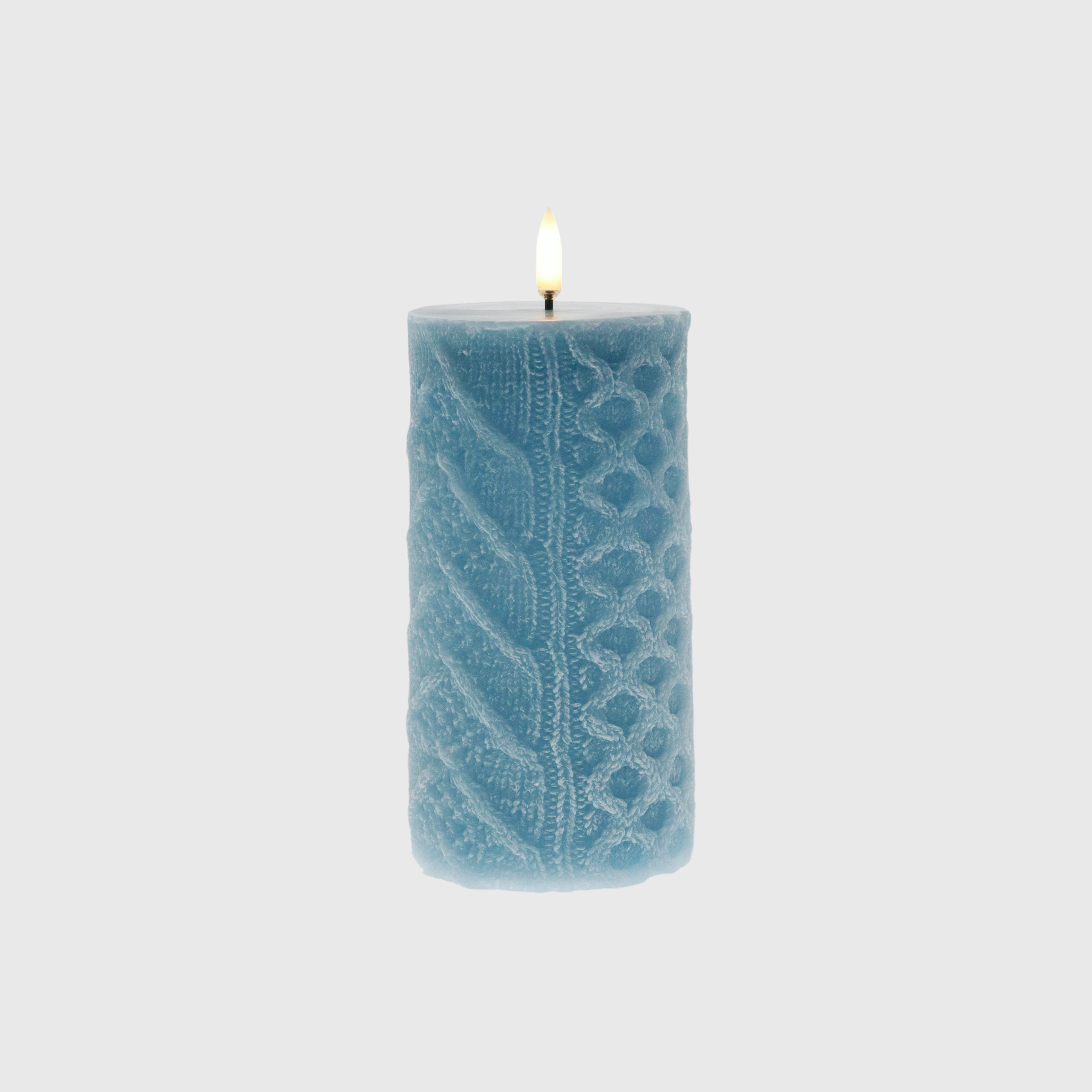 Embossed with a cable stitch design in soothing blue, this candle blends comfort with style. Its realistic flame glows warmly, perfect for cozy retreats, seasonal décor, or creating peaceful moments of light.