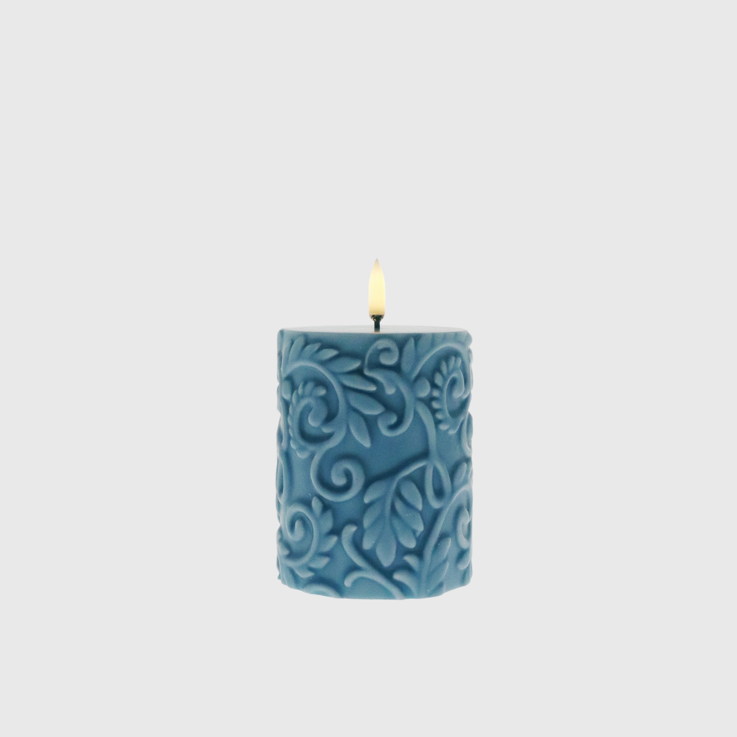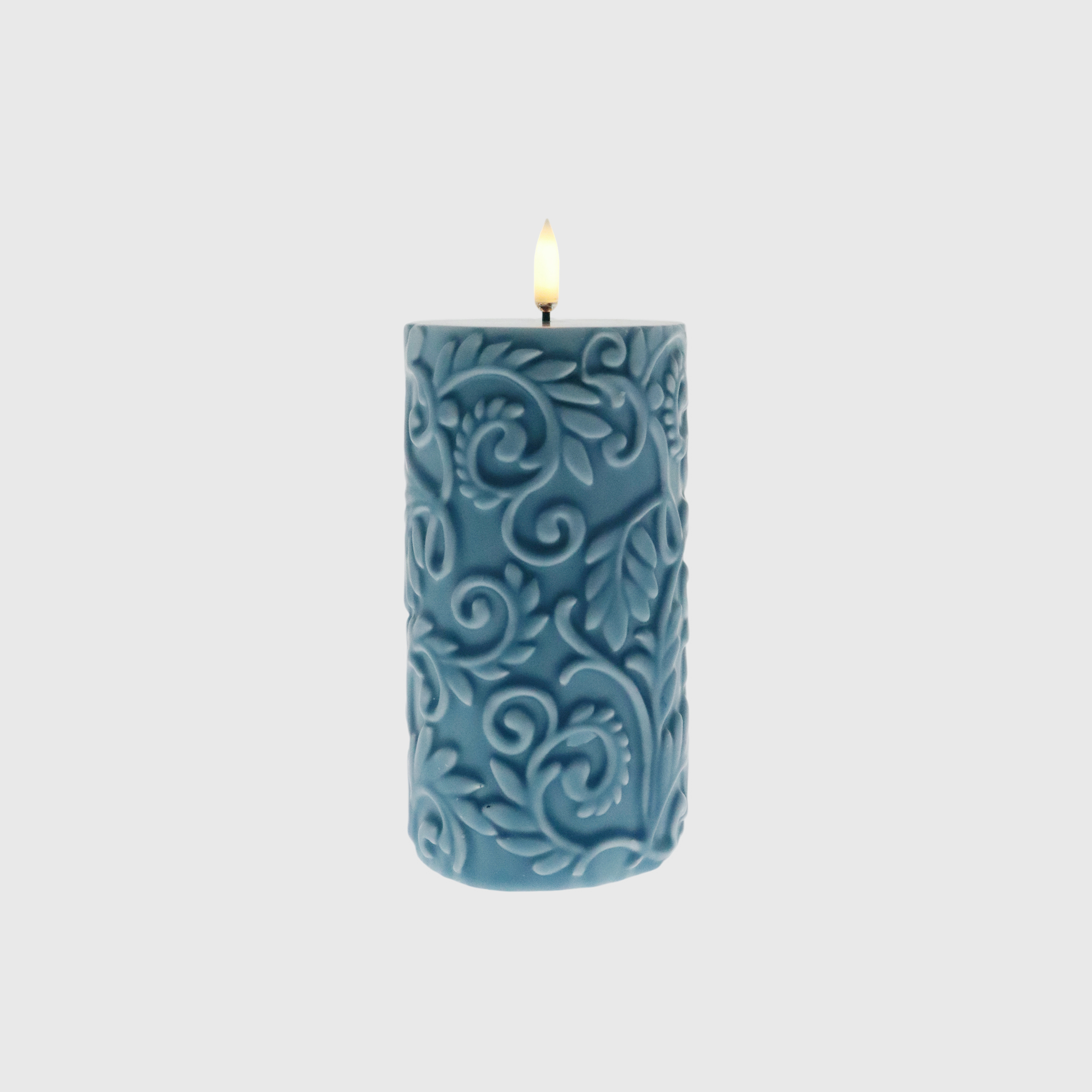 With embossed laurel patterns in a calming blue, this candle blends texture and serenity. Its realistic flame adds warmth, making it a soothing accent for peaceful spaces or artistic interiors that value refined detail.