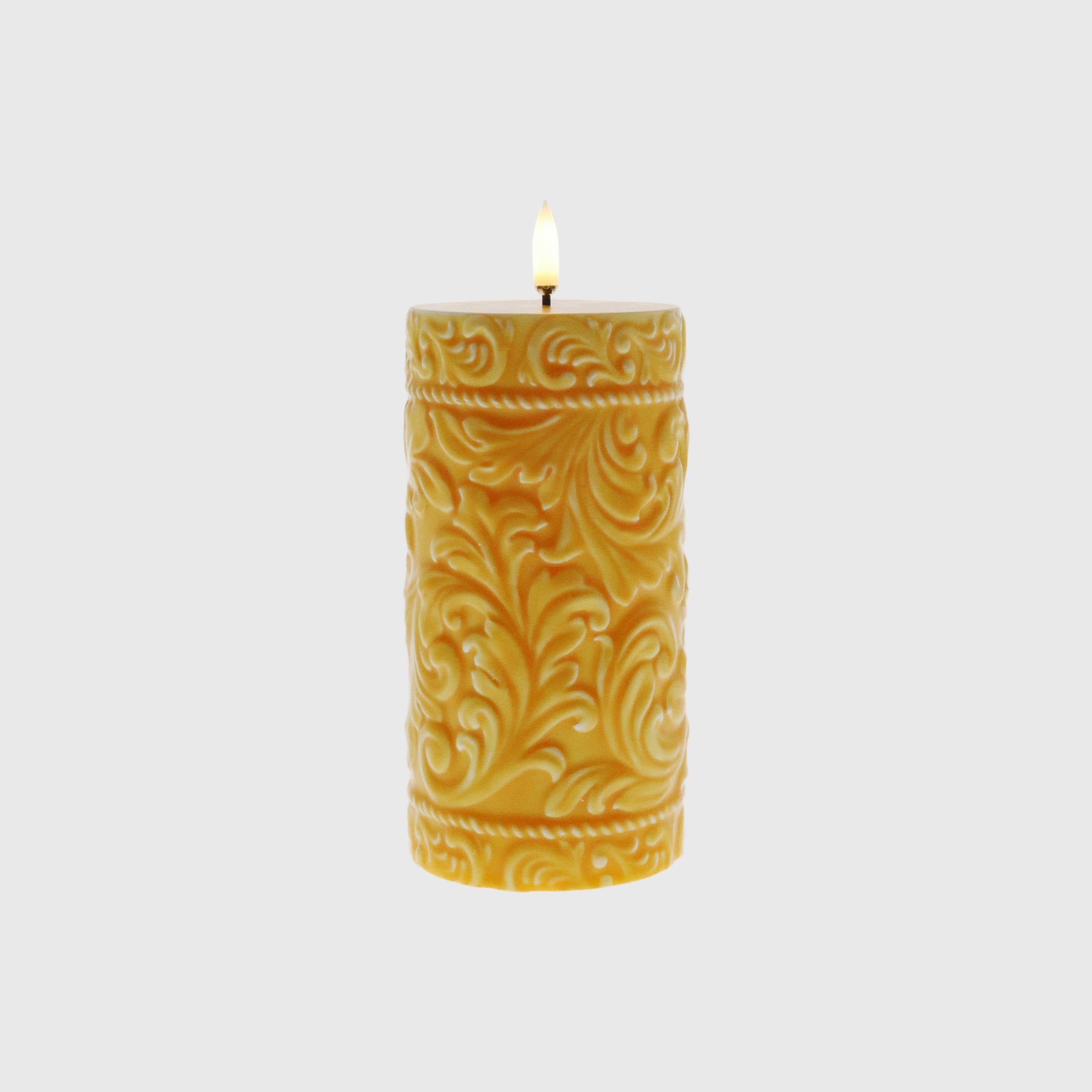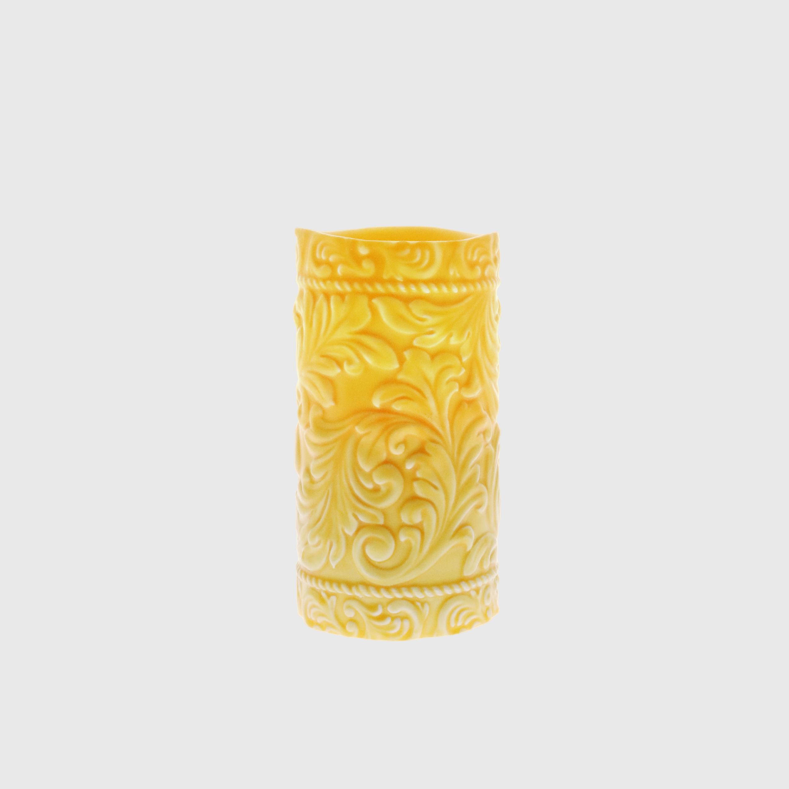 Golden yellow tones and embossed cord-and-laurel design create a radiant centerpiece. Its lifelike flame glows brightly, bringing joyful warmth to celebrations, seasonal gatherings, or everyday spaces that welcome vibrant charm.