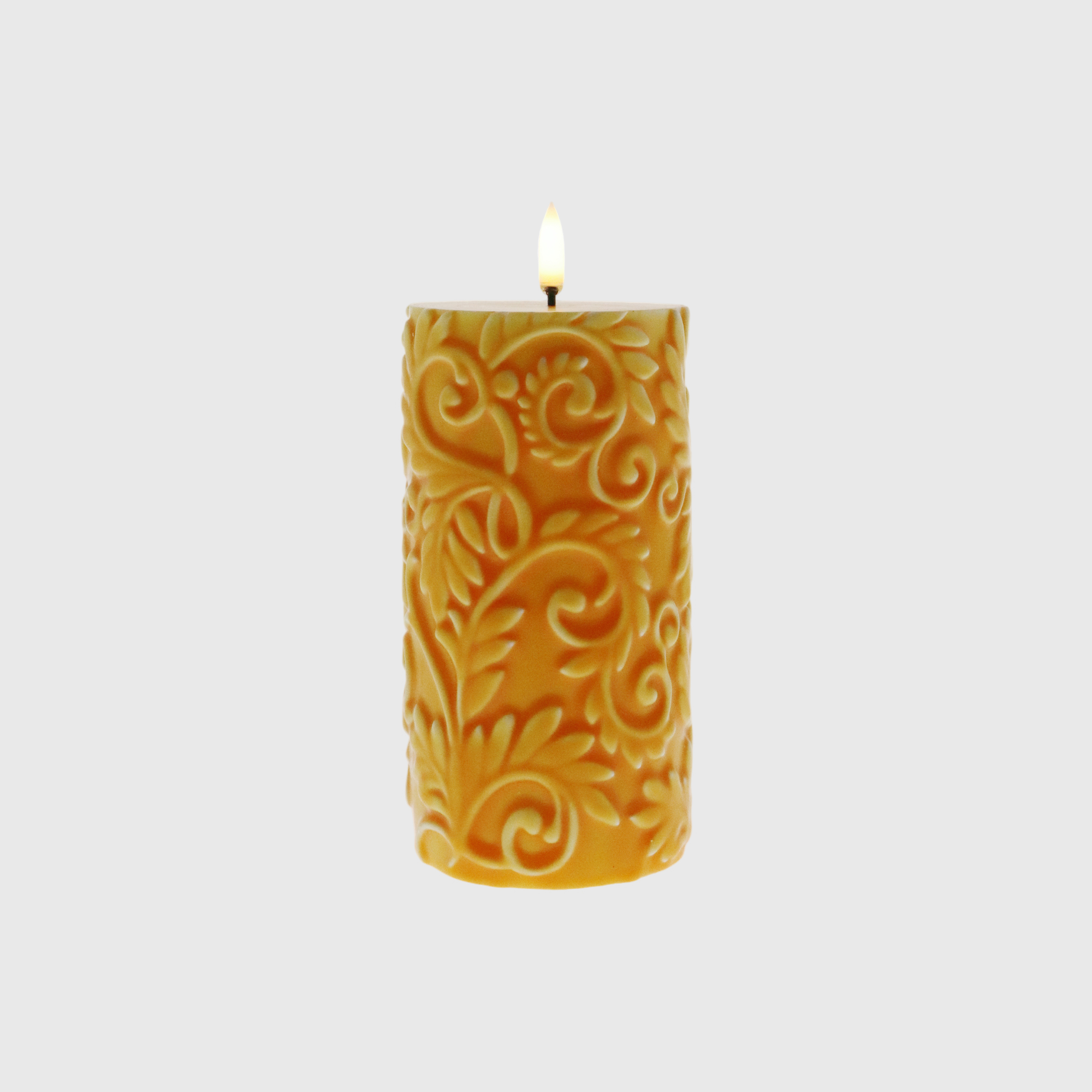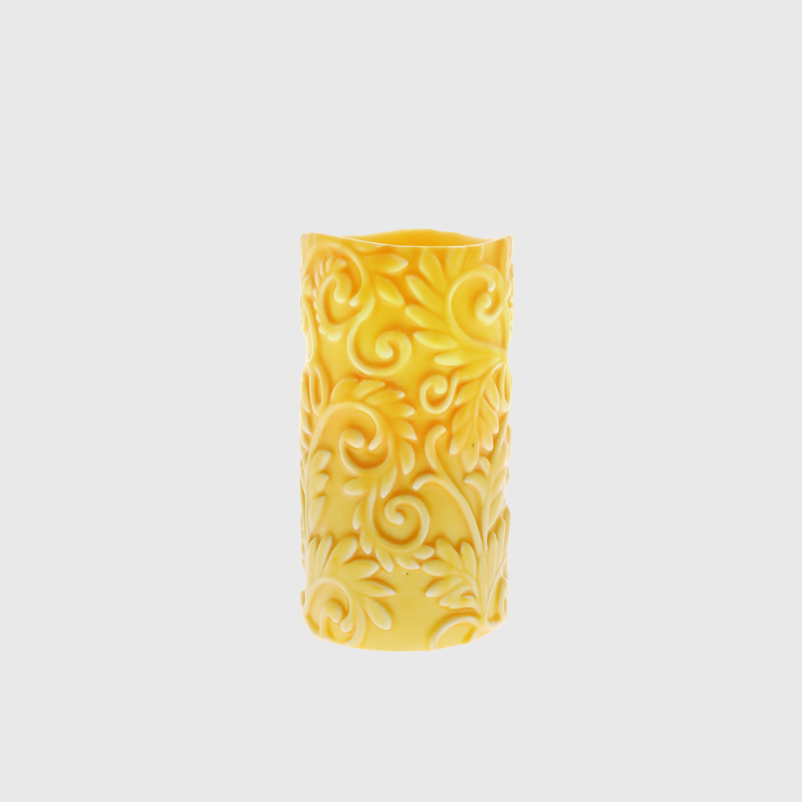 Golden yellow tones meet embossed laurel artistry in this vibrant candle. Its lifelike flame shines brightly, perfect for joyful occasions, uplifting décor, or bringing a cheerful glow to everyday living spaces.