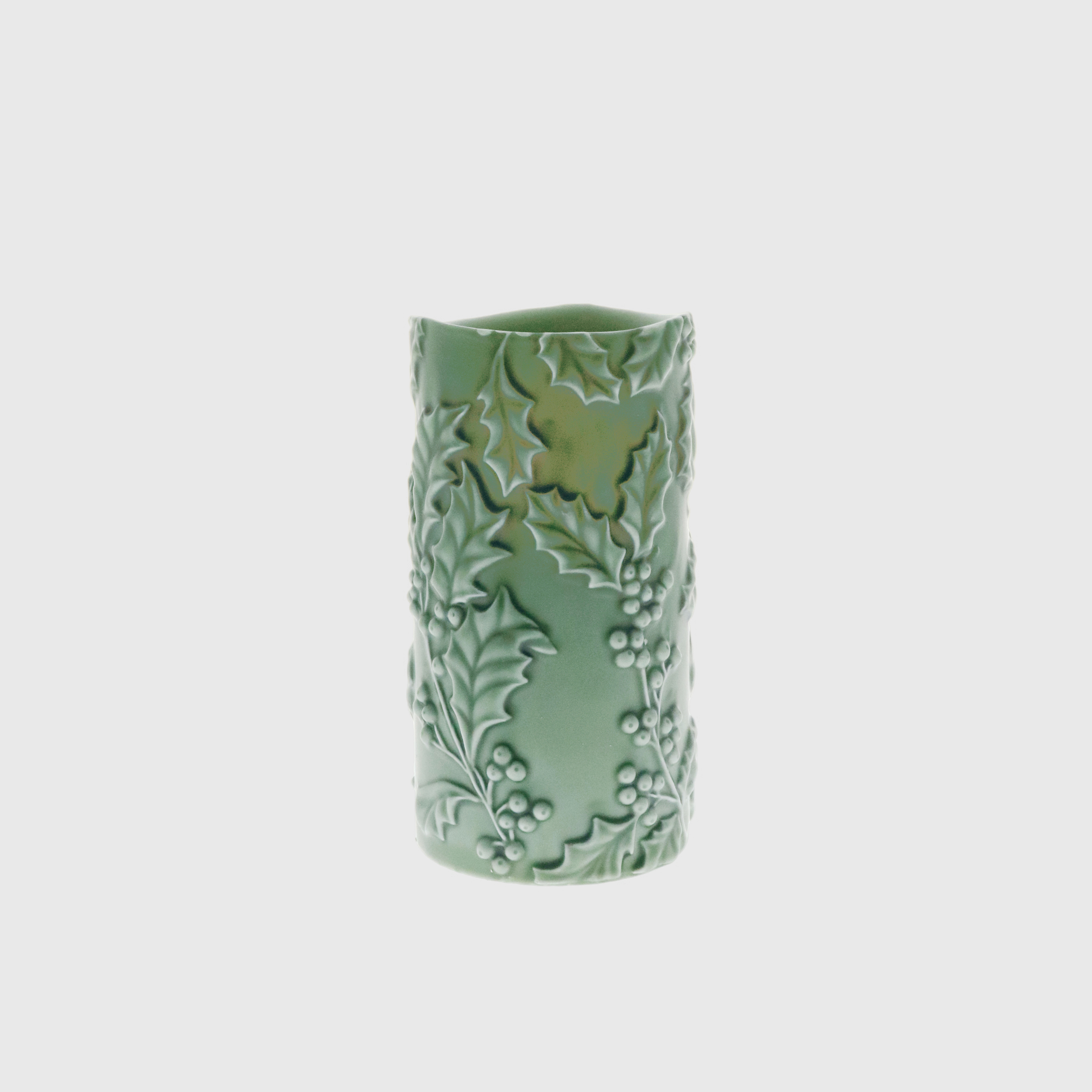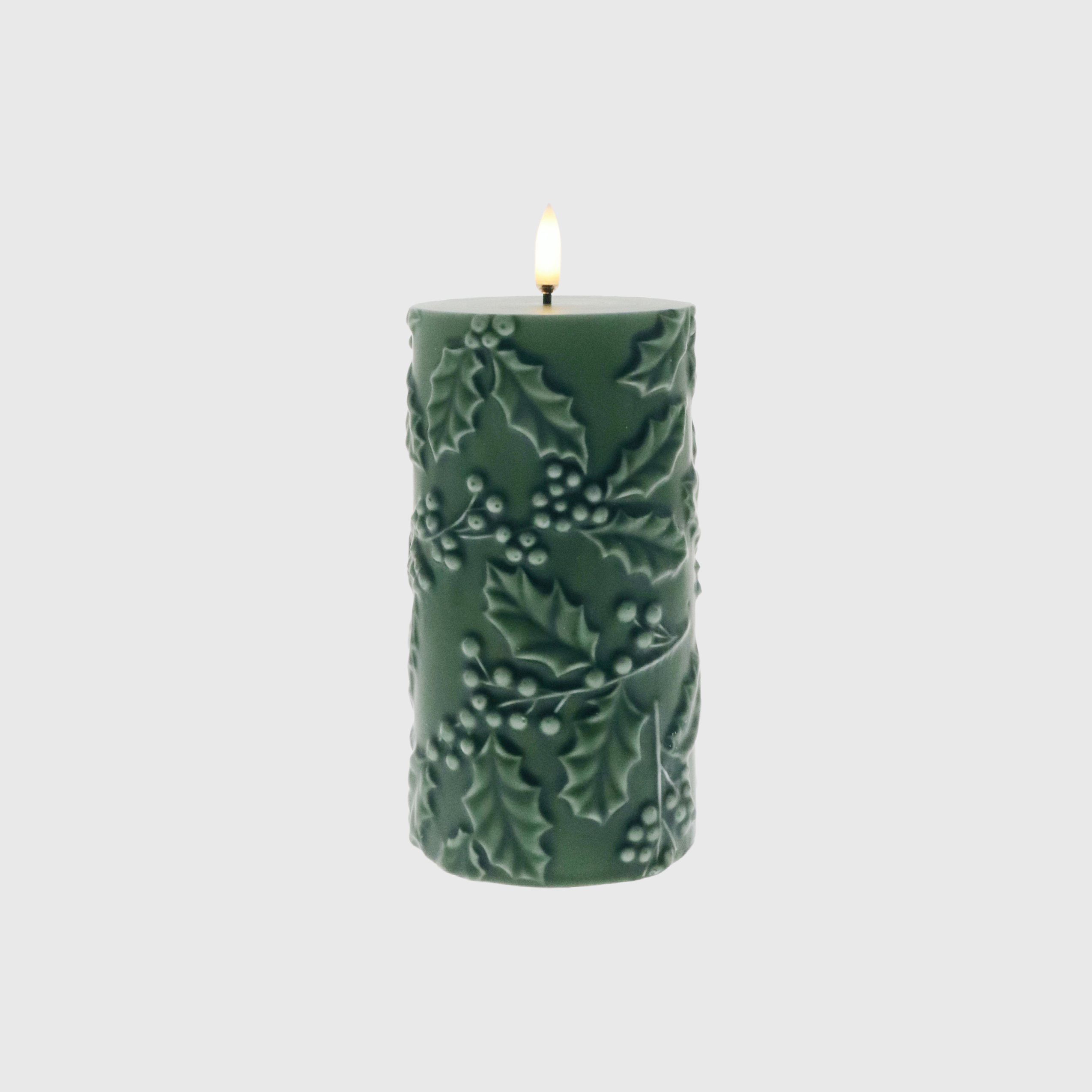 Festive and natural, this candle features embossed holly leaves in vibrant green. Its lifelike flame glows warmly, making it the perfect accent for holiday décor, seasonal celebrations, or joyful spaces year-round.
