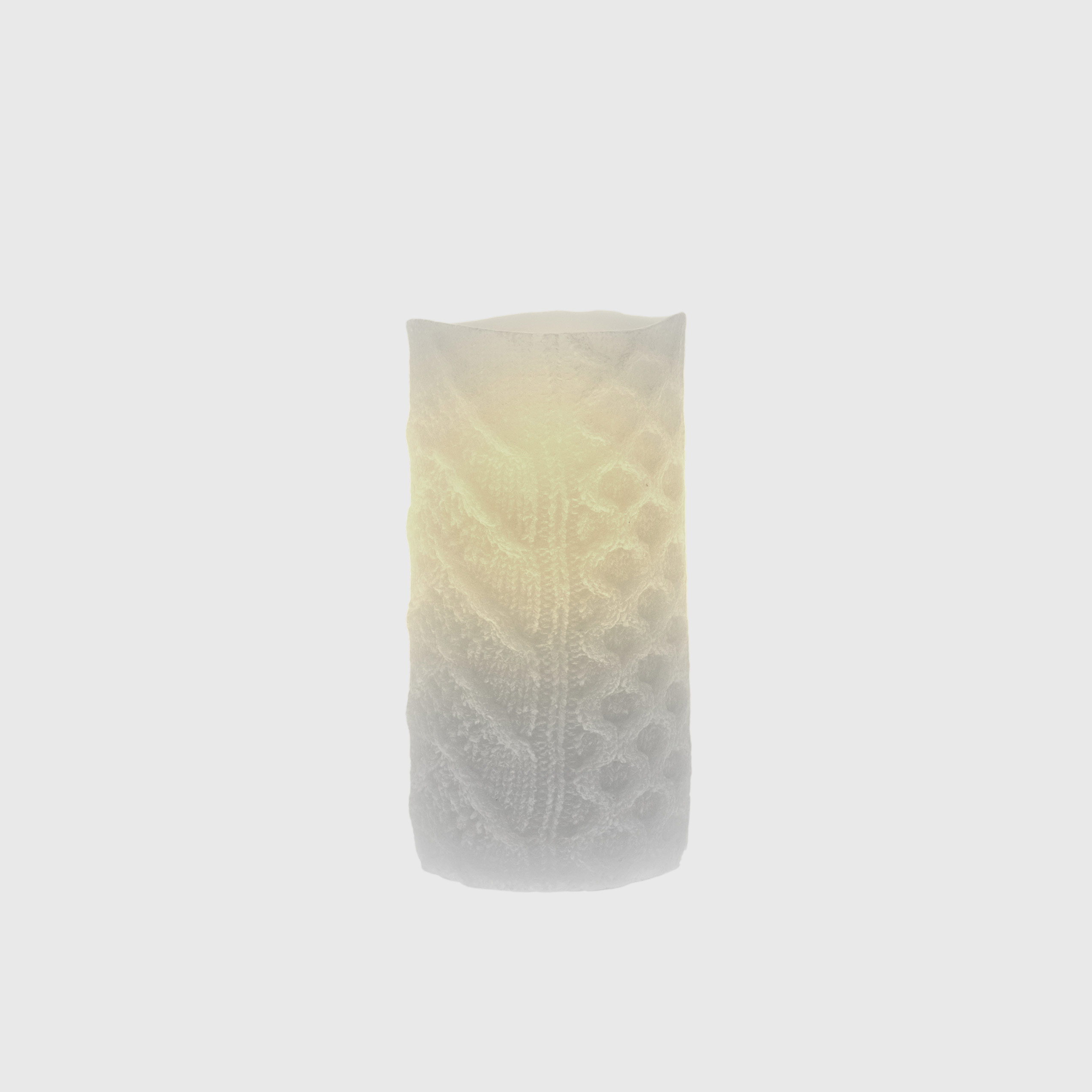 A classic grey candle with cable stitch embossing evokes knit textures and warmth. Its lifelike flame flickers gently, making it an inviting accent for cozy interiors, winter décor, or quiet evenings.
